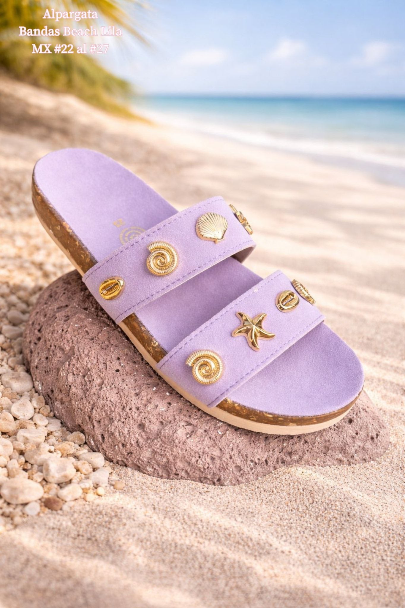 Sandalia de playa diseñada con dos bandas ajustables en lila que ofrecen sujeción cómoda y segura. Adornada con perlas que añaden un toque elegante y sofisticado a tu look playero. La construcción ligera y flexible permite libertad de movimiento, mientras que la suela resistente proporciona tracción en superficies mojadas. Perfecta para disfrutar del mar con estilo y comodidad durante todo el día.