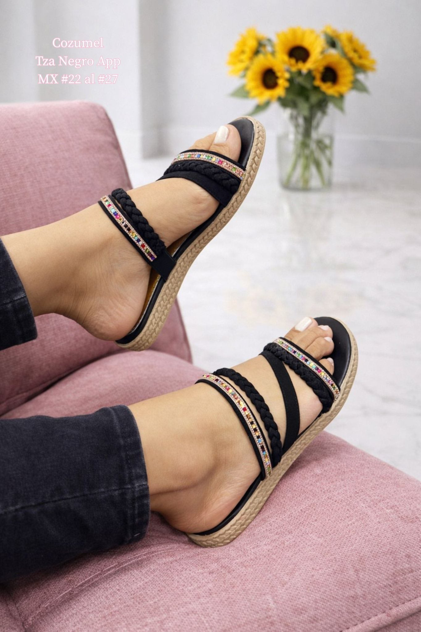 Sandalia artesanal de Cozumel confeccionada con suela resistente y reforzada. Diseño distintivo que combina dos tiras de aplicación con detalle de trenza, creando una pieza versátil y elegante. Perfecta para el uso diario, ofrece comodidad y durabilidad. El acabado en negro proporciona versatilidad para combinar con diferentes estilos de vestuario. Una opción auténtica que refleja la tradición y calidad de la artesanía mexicana.